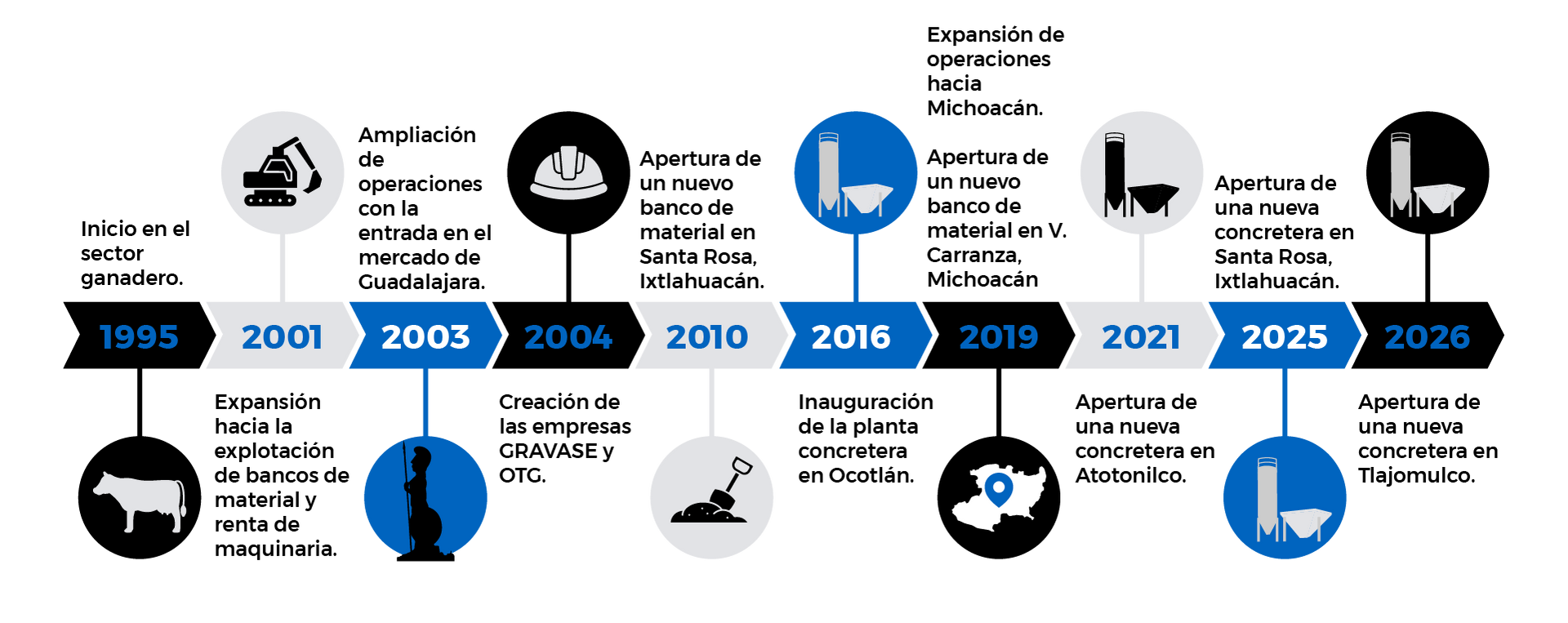 consolidando su presencia en proyectos clave como el Macrolibramiento de Guadalajara, el Aeropuerto Internacional de Guadalajara y el mantenimiento de las vías de Ferromex.